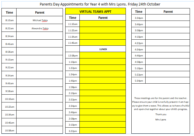 Have you booked your parent’s day appointment for Friday 24th October? Please email me your prefered time and I will do my best to accomodate you.